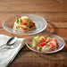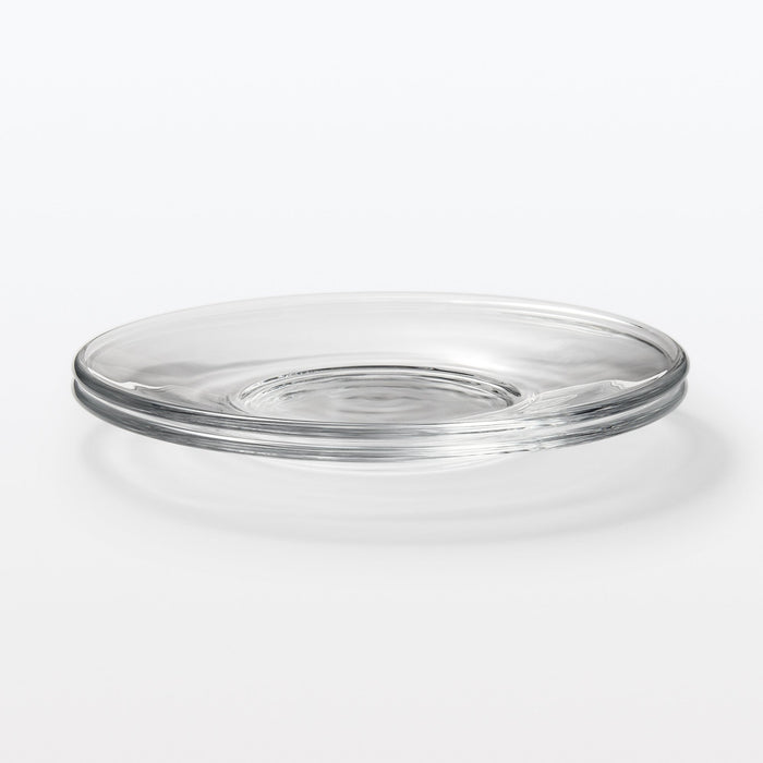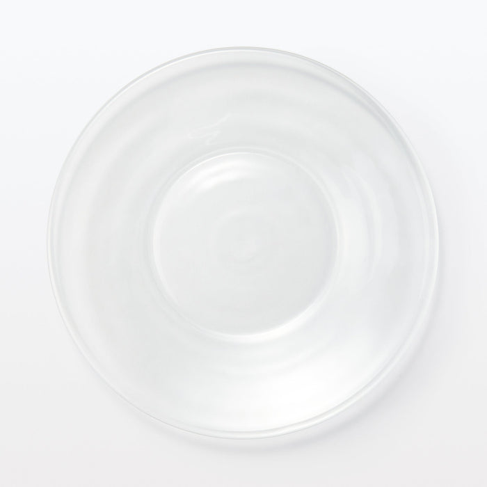 A transparent plate made from soda glass. It's wavy surface texture is reminiscent of hand blown glass.