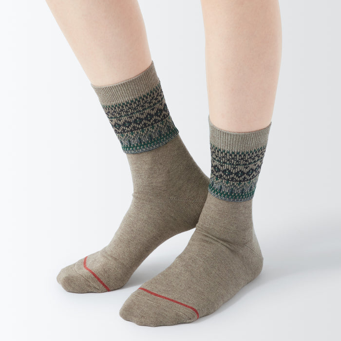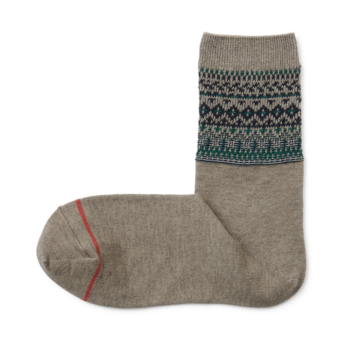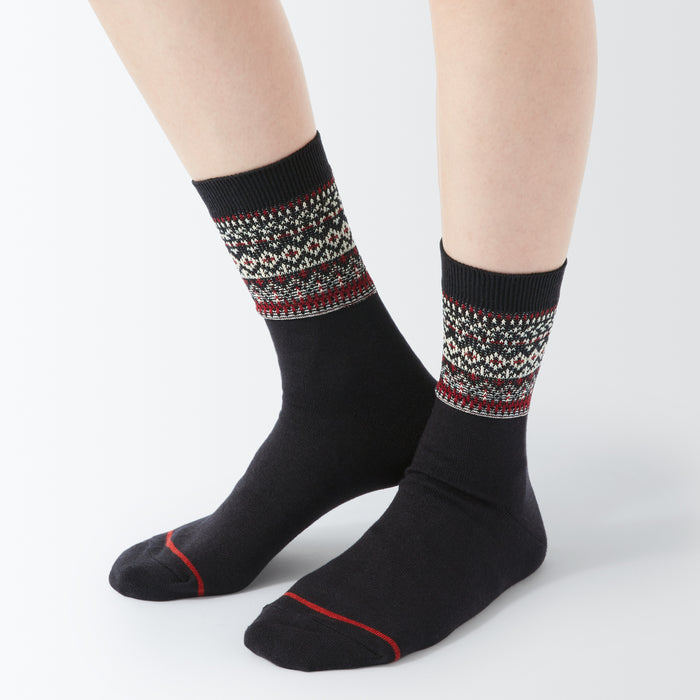 Warm socks with intricate winter designs, constructed with a blend of soft, insulated cotton and wool yarns. A portion of the cotton has been specially treated to capture your body heat, keeping you warm during colder weather. They have a red or white line marker at the toes to identify after washing.
