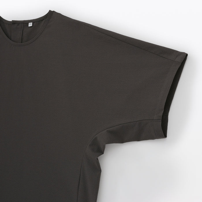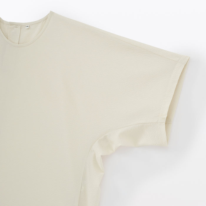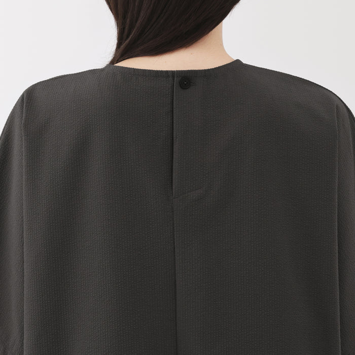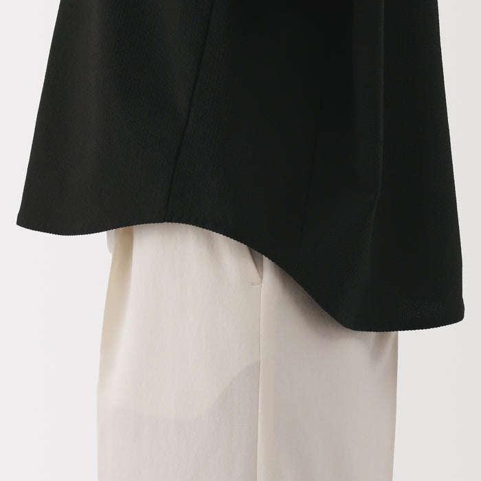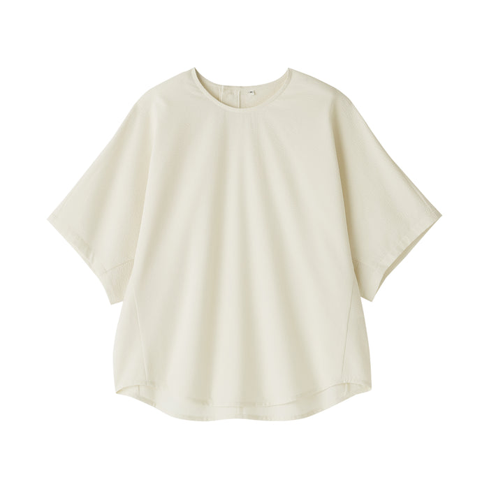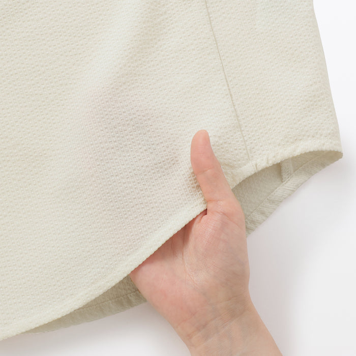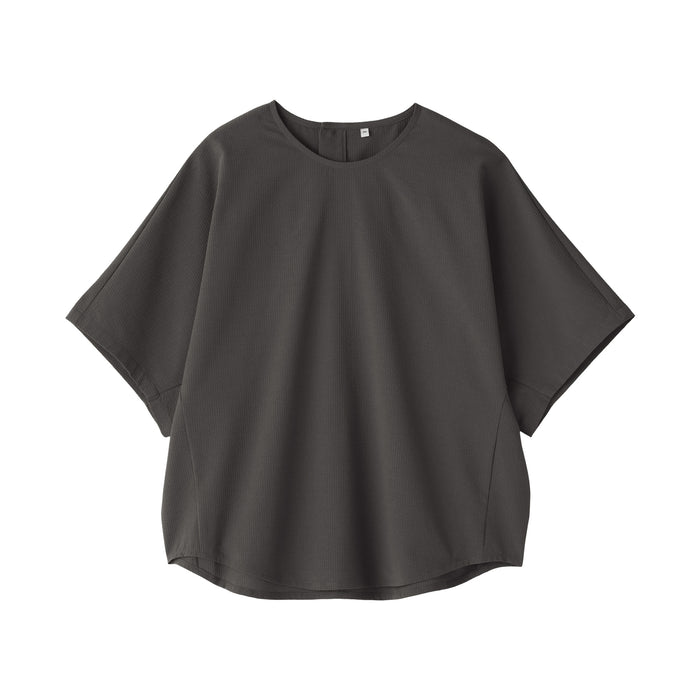 This short sleeve blouse is made with a cool, airy seersucker material with tiny ventilation holes created through special processing for breathability. It is designed with a roomy silhouette that is breezy and comfortable to wear on hot days. The material is slightly stretchy, so it is easy to move around without restriction.