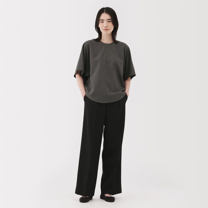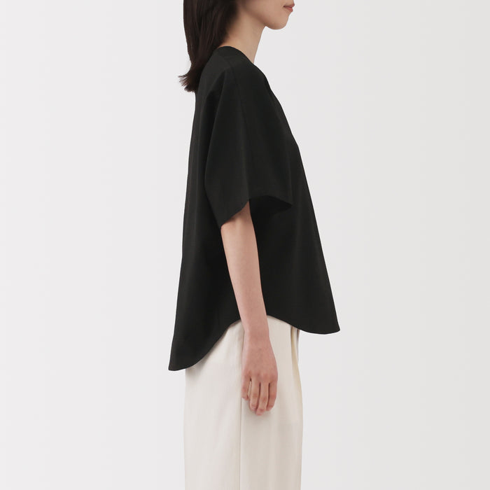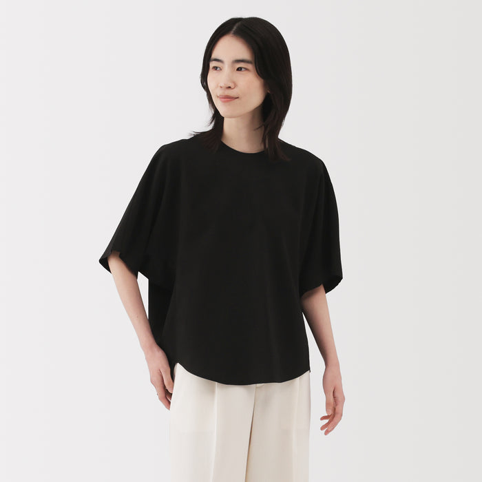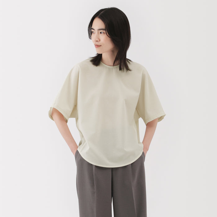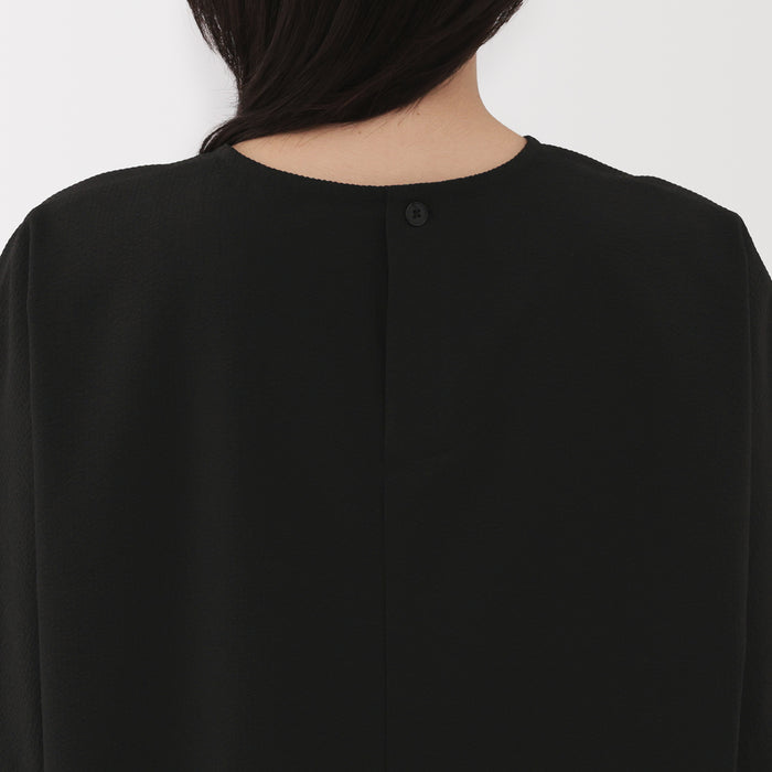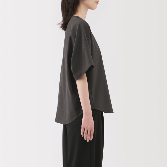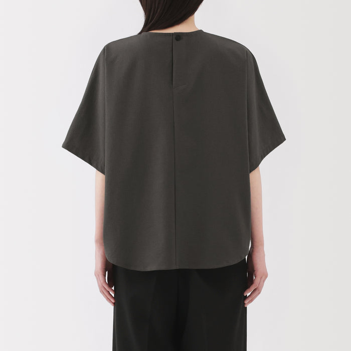 This short sleeve blouse is made with a cool, airy seersucker material with tiny ventilation holes created through special processing for breathability. It is designed with a roomy silhouette that is breezy and comfortable to wear on hot days. The material is slightly stretchy, so it is easy to move around without restriction.
