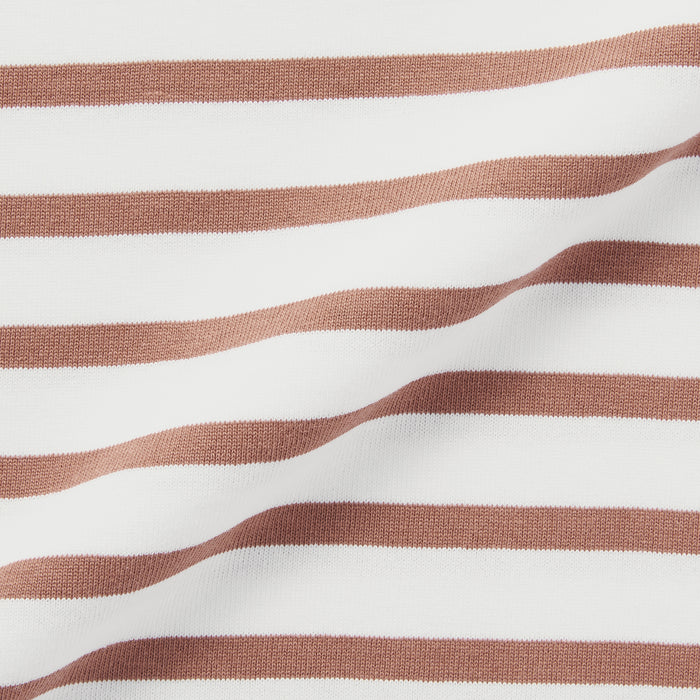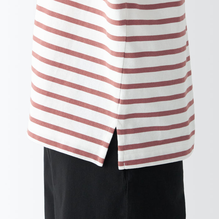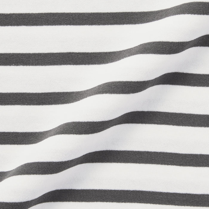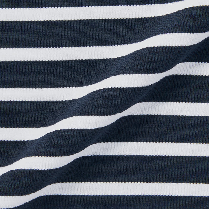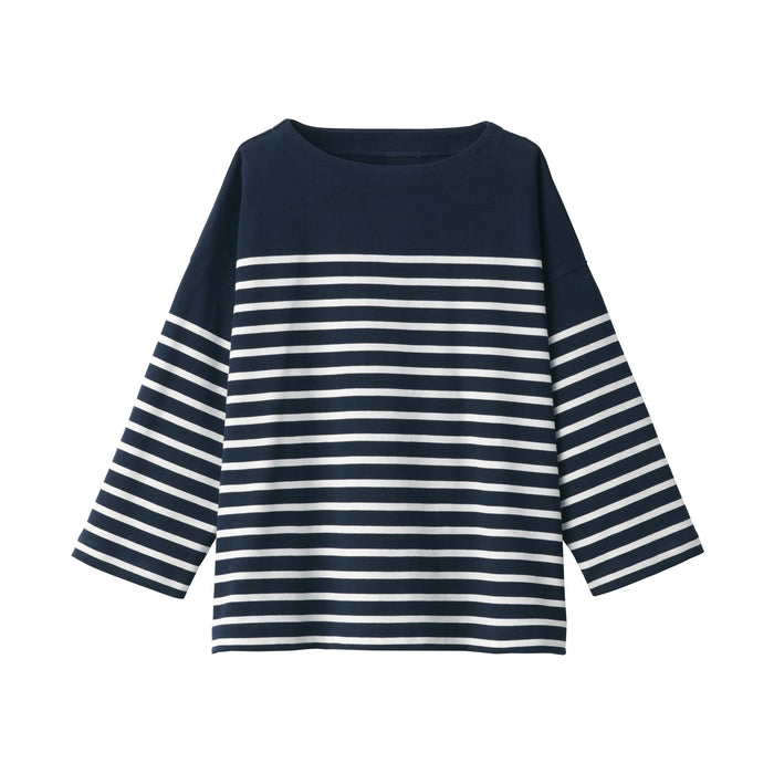 A boat neck shirt made using a sturdy fabric with minimal pilling.