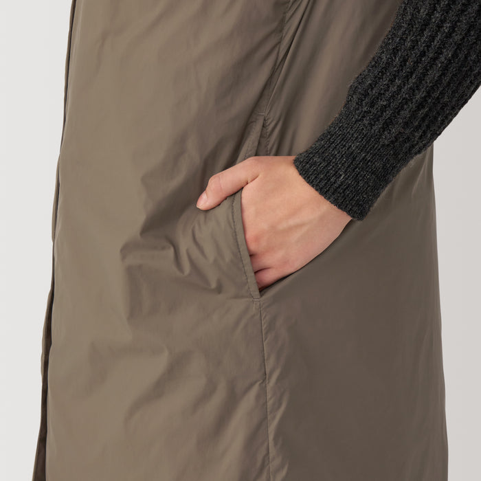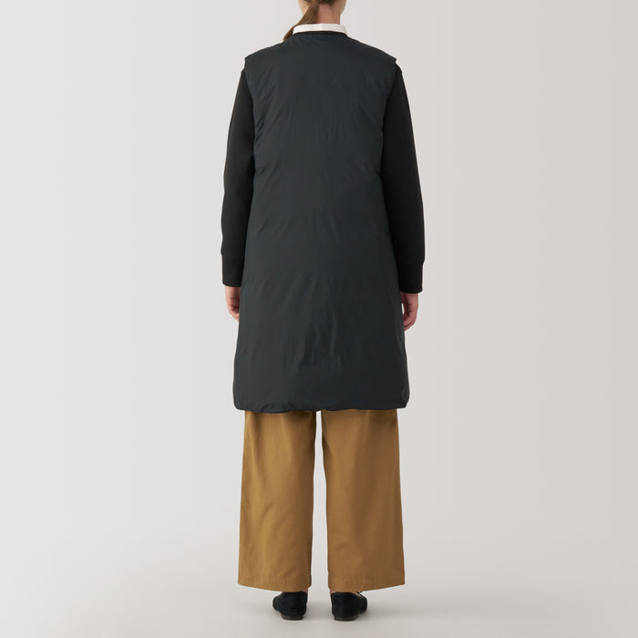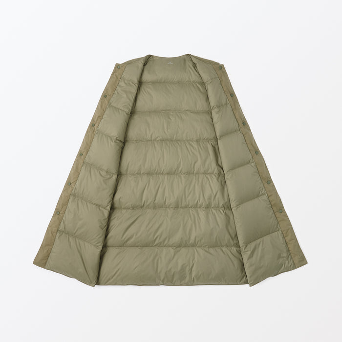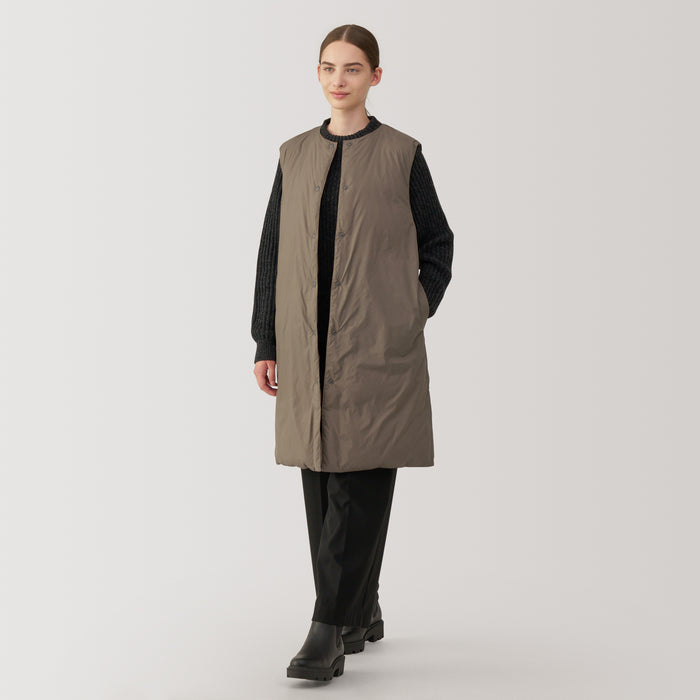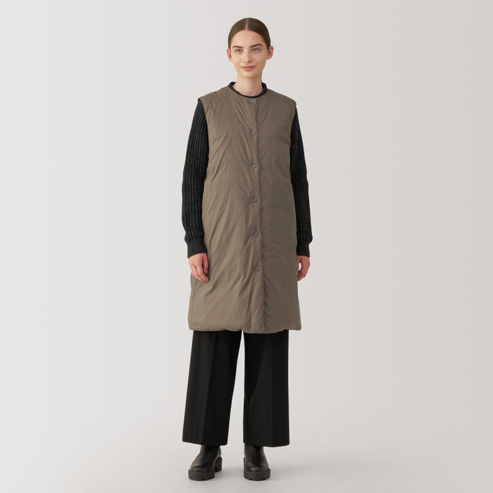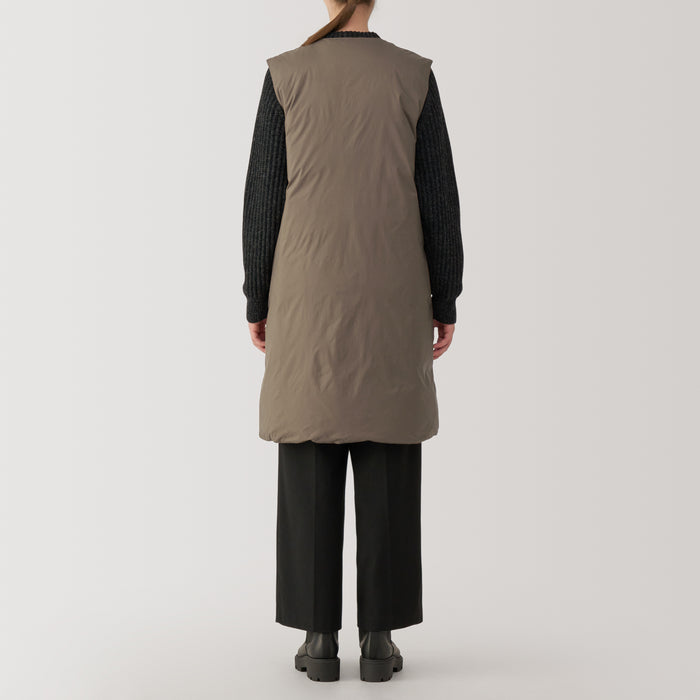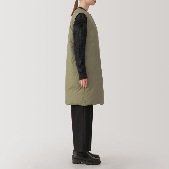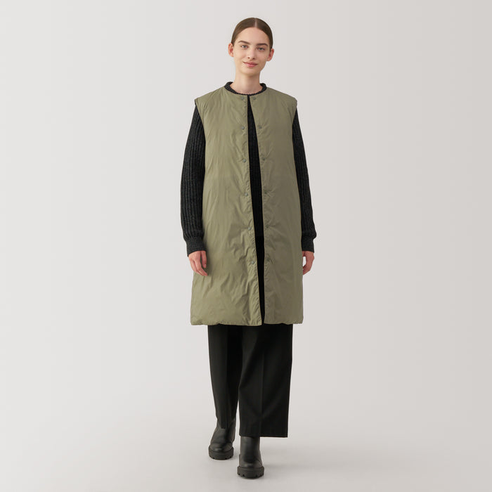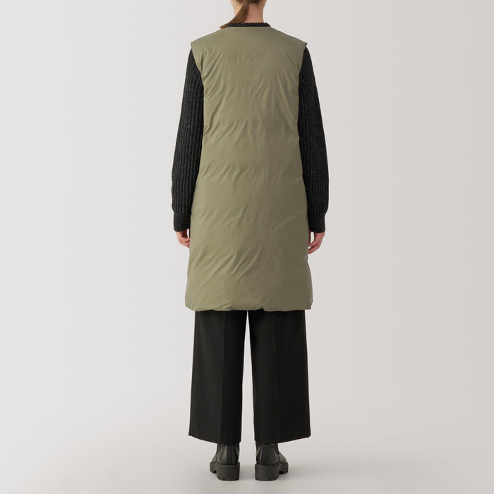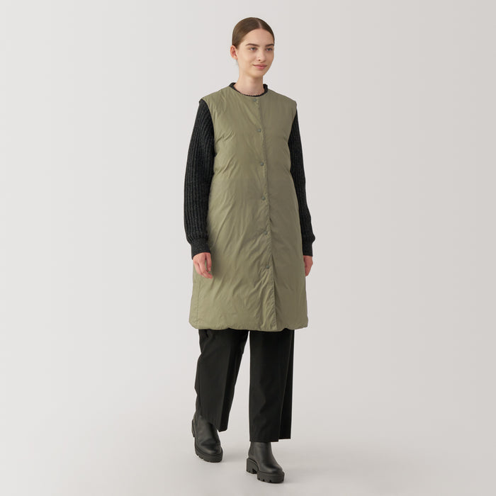 A lightweight down long vest made with recycled nylon fabric and an anti-static lining. Designed to be foldable and easy to carry. Thick and light enough to be layered in the winter. Made with fill power 750 down. Water repellent.
