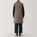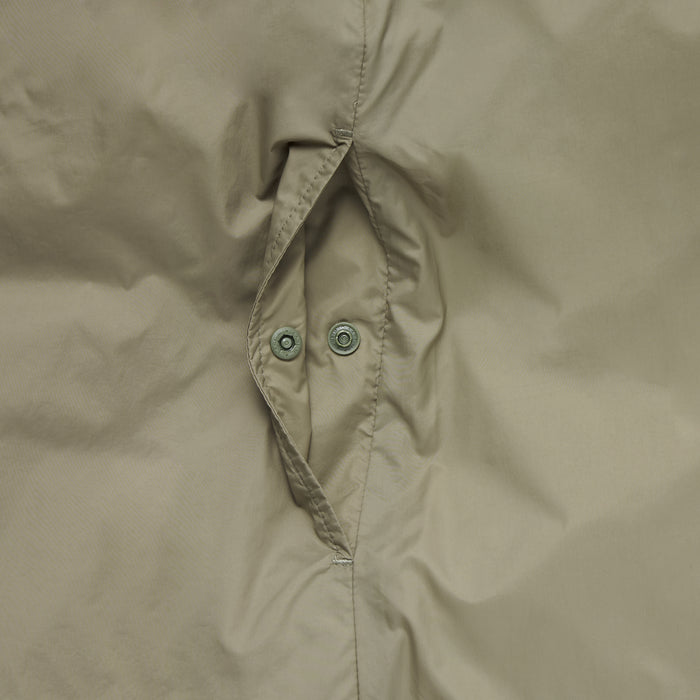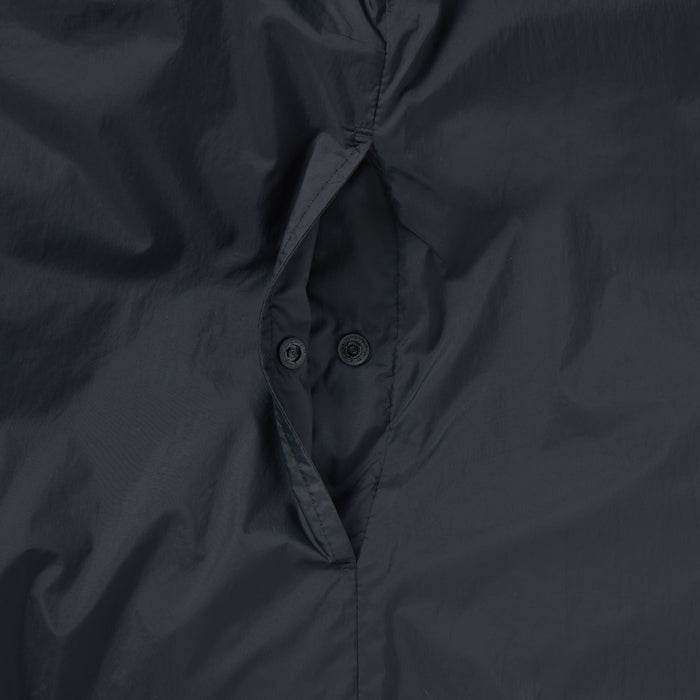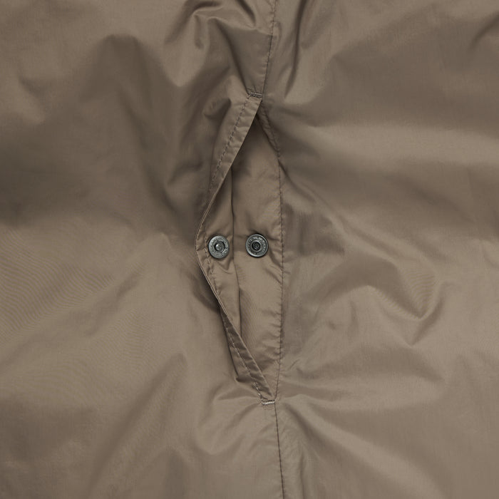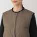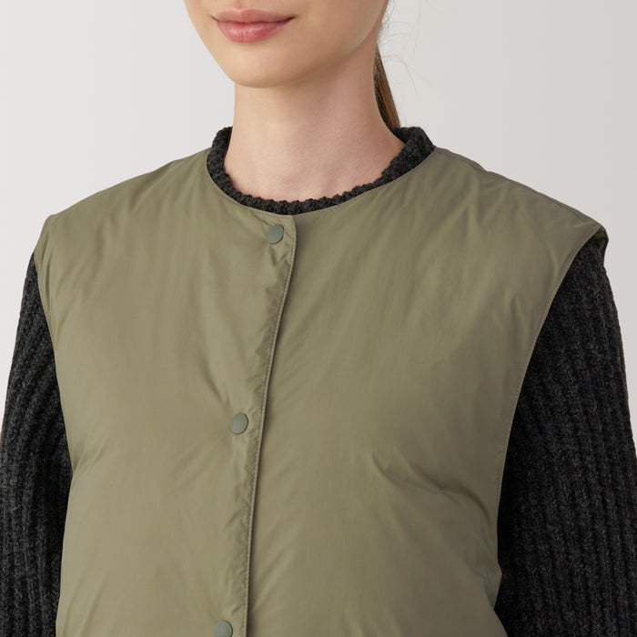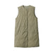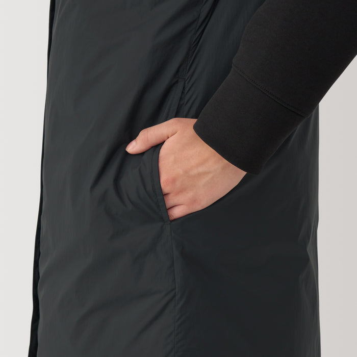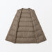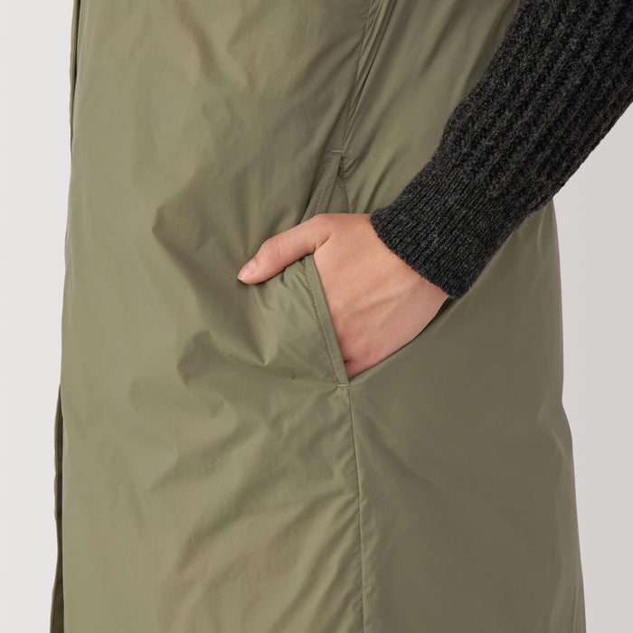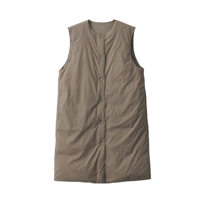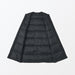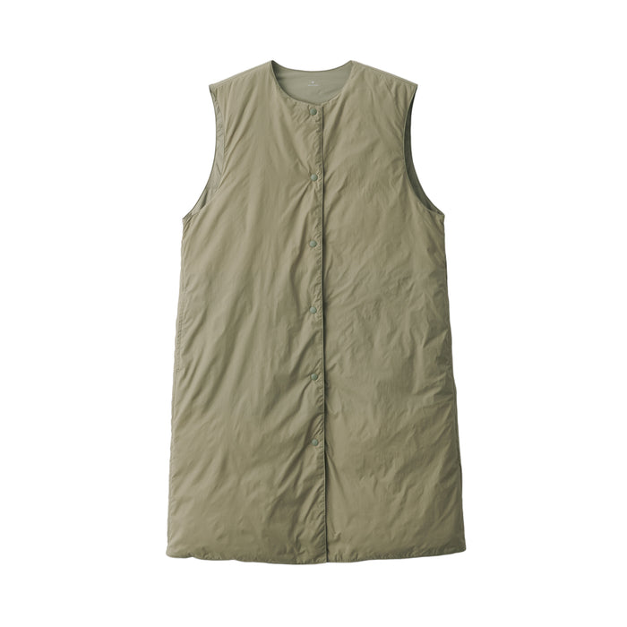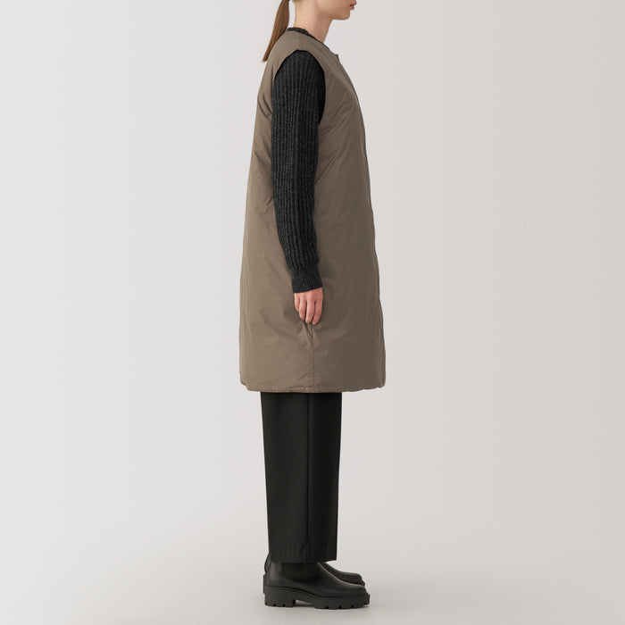 A lightweight down long vest made with recycled nylon fabric and an anti-static lining. Designed to be foldable and easy to carry. Thick and light enough to be layered in the winter. Made with fill power 750 down. Water repellent.