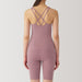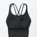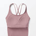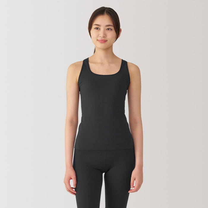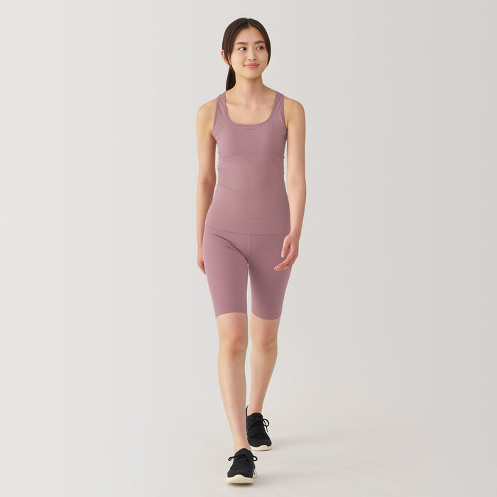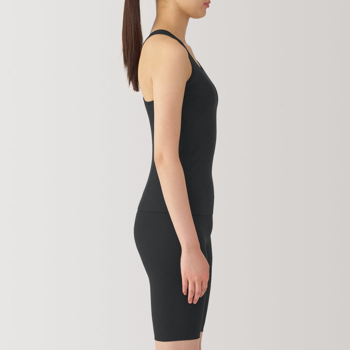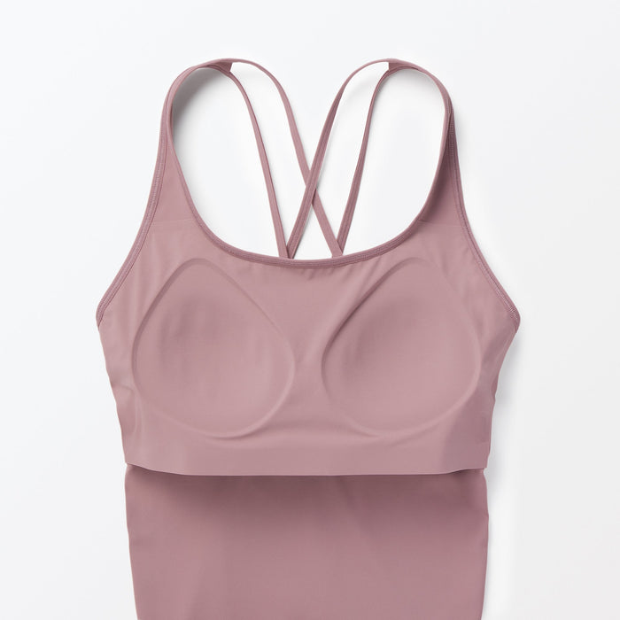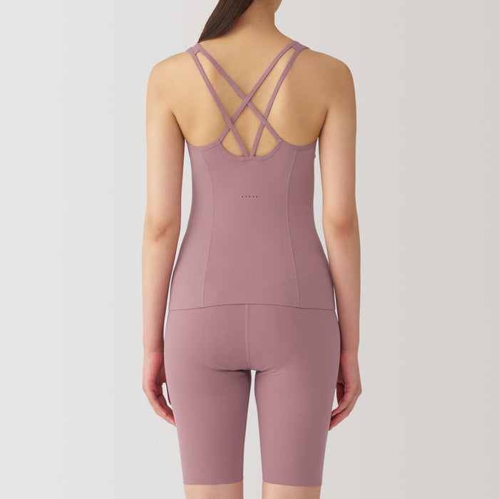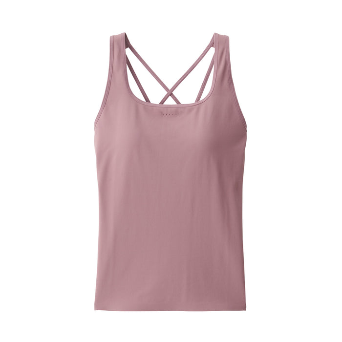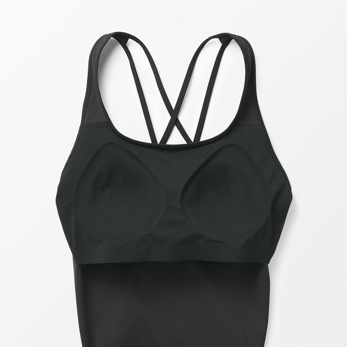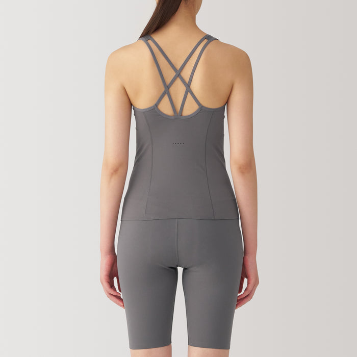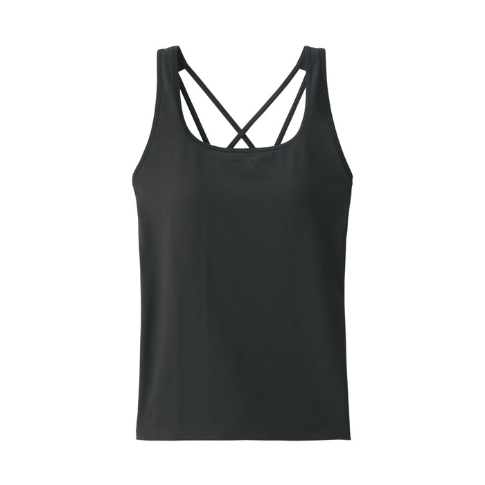 A cross back tank top with a built-in bra so you only need to wear one layer. Made with a silky, quick drying material that has a flexible stretch. Blocks 90% or more of UV rays.